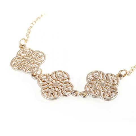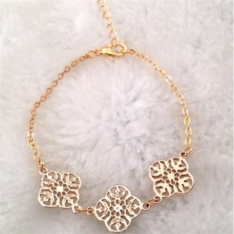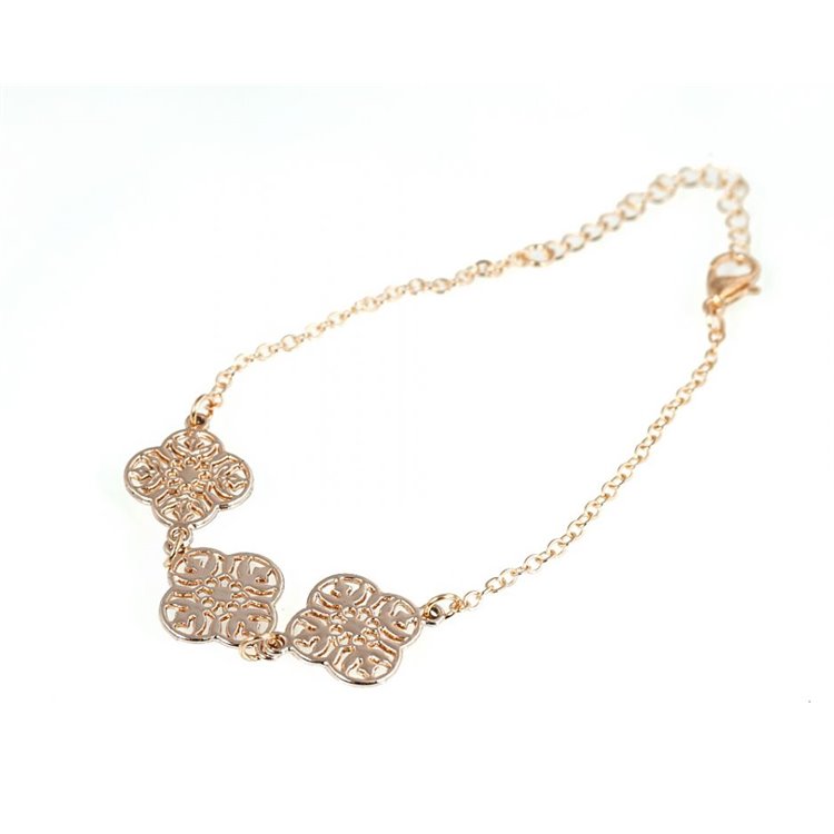 Bransoletka o kształcie ażurowej koniczyny na delikatnym łańcuszku.Bransoletka świetnie pasuje do eleganckich, jak również do codziennych stylizacji.Idealny dodatek do każdego zegarka!Wymiary:długość 19 + 5 cm Bransoletka w kolorze złotym.