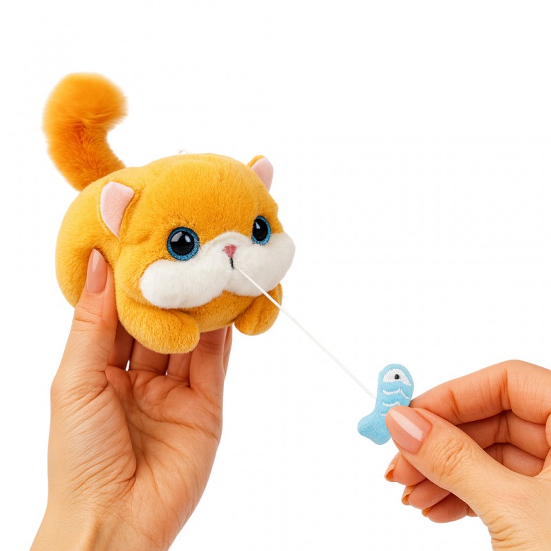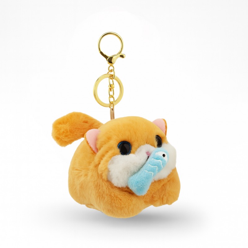 Brelok do kluczy – Kot łapiący rybę z kręconym ogonkiem, kremowy BRL398K