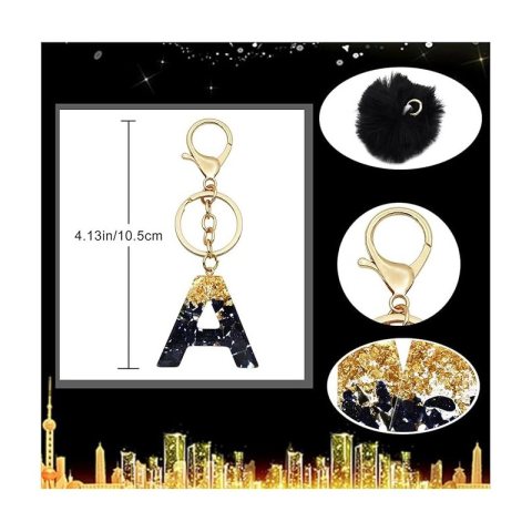 Brelok do kluczy LITERKA „J” czarno-złota z pomponem, żywica BRL342J