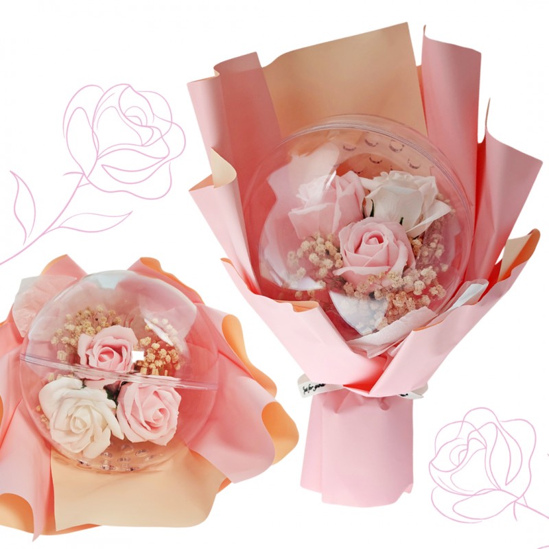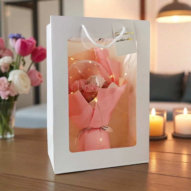Bukiet kwiatów zapachowych kwiatów mydlanych w ozdobnej torebce Subtelny i wyjątkowy prezent dla kobiety, idealny na wiele okazji. Bukiet kwiatów mydlanych jest umieszczony w ekskluzywnym opakowaniu, ozdobionym subtelnymi zdobieniami i kokardą. Dodatkowo kwiaty zamknięte są w przezroczystej kuli, która dodatkowo chroni je przed uszkodzeniami. Gotowy do wręczenia jako prezent dla Twojej ukochanej osoby. Każdy kwiat jest starannie wykonany, aby oddać piękno prawdziwego kwiatu. Specyfikacja: – Opakowanie z tworzywa sztucznego, – Wewnątrz światełka LED, 3 tryby świecenia, baterie w zestawie – Możliwość włączania i wyłączania lampek. Produkt do samodzielnego złożenia Materiał: kwiaty mydlane / opakowanie z papieru i tworzywa sztucznego. Wymiary: Wysokość: około 30 cm Szerokość bukietu: około 21 cm Wymiary torebki: 24 cm x 14 cm x 35 cm Waga bukietu: 174g Waga produktu z opakowaniem: 257g