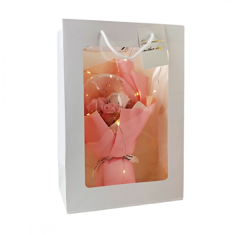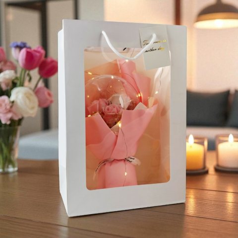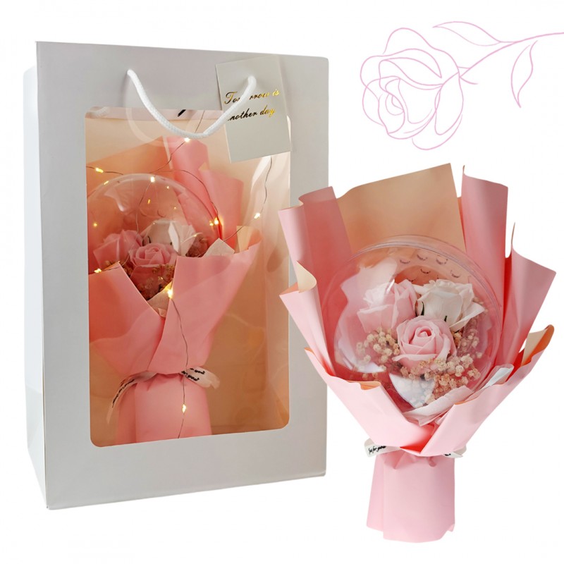 Bukiet zapachowych kwiatów mydlanych w torebce na prezent, kula, świecące LED – BUK14R