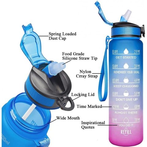 Butelka na wodę, bidon z miarką i słomką 1L OMBRE Niebieski z Fuksją BD18