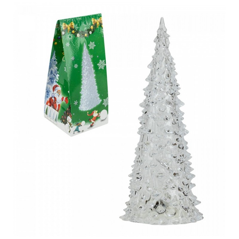 Choinka led figurka świąteczna Cechy produktu: Elegancka dekoracja, Świąteczna figurka ma kształt choinki, Choinka świeci w wielu zmieniających się kolorach, jest wyposażona w diody LED, Wykonana z wytrzymałego tworzywa. Specyfikacja: Wysokość 27 cm, Średnica podstawki 11 cm, Wymiary opakowania: 11,5 x 11,5 x 27,5 cm, Kolor: bezbarwny Baterie w zestawie Włącznik/wyłącznik pod spodem. Waga: 185g netto / 240g brutto Idealnie sprawdzi się jako dekoracja w domu, dodatek do stroików, na cmentarz. Postawiona na regale wśród książek, na biurku lub na ławie, wszędzie przypomina o zbliżających się Świętach. Maleńka akrylowa choinka LED zasilana bateriami, przywołuje ciepłe bożonarodzeniowe myśli.