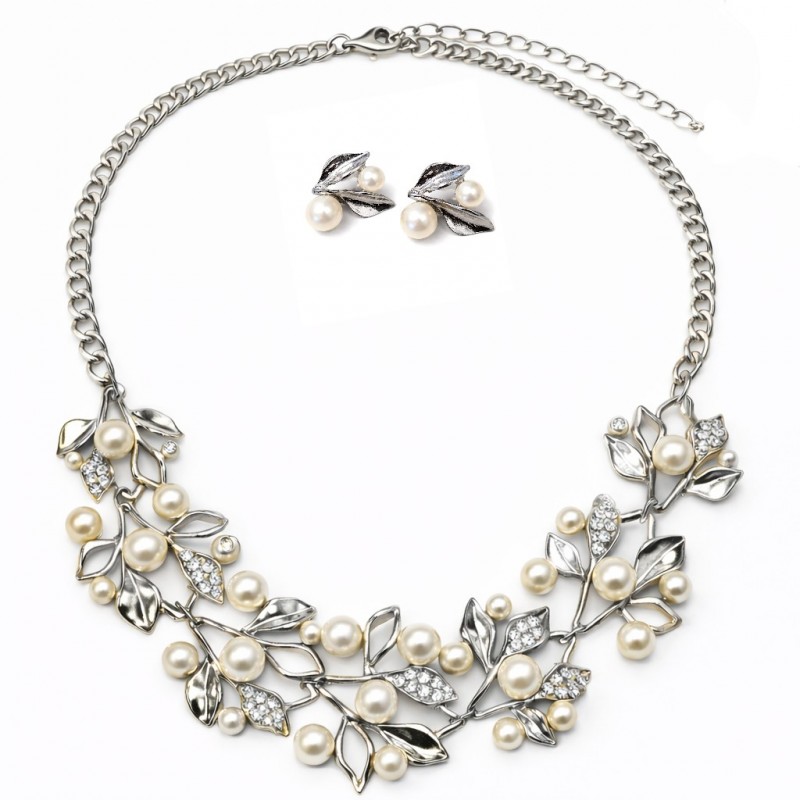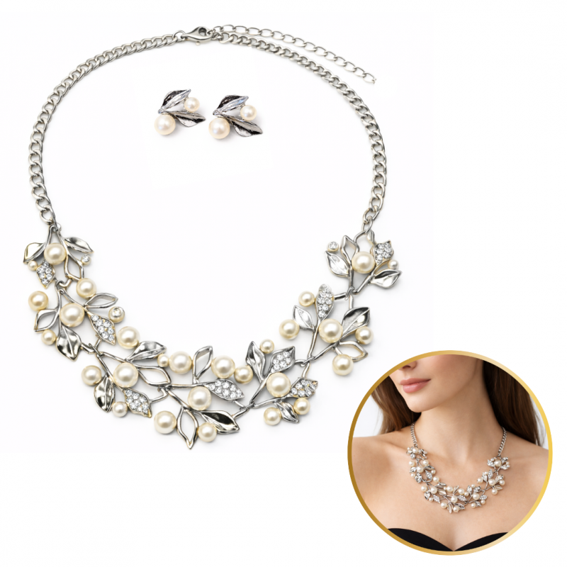 Elegancki Zestaw Biżuterii Naszyjnik + kolczyki z Perłami i Kryształami, Listki srebrne N1072