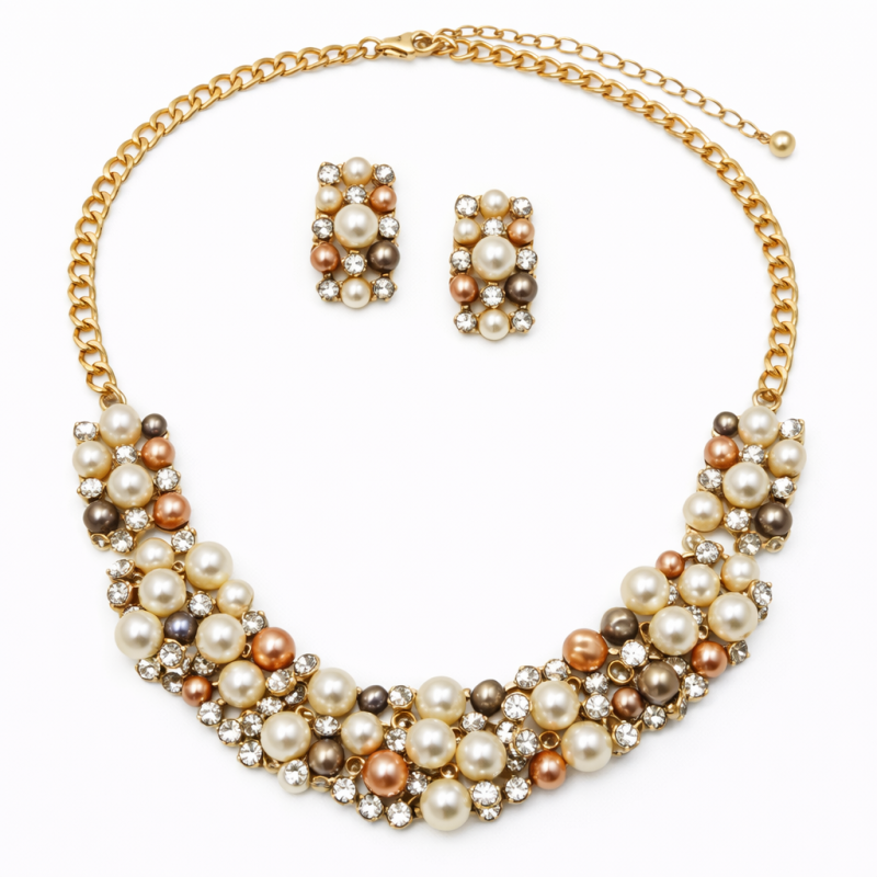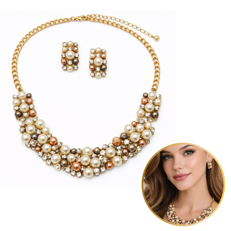 Elegancki Zestaw Biżuterii z Perłami i Kryształami – Naszyjnik + Kolczyki N1070BR