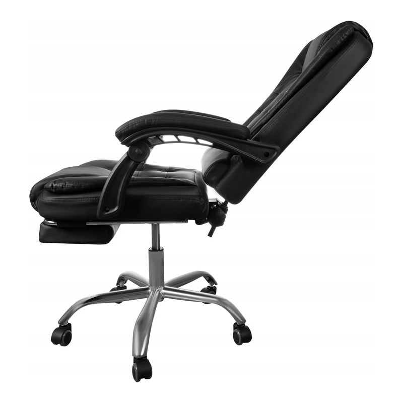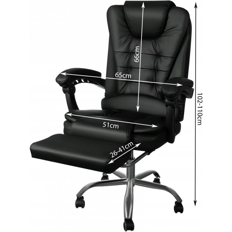 KOMFORTOWY FOTEL BIUROWY Z PODNÓŻKIEM Wymiary: Całkowita wysokość fotela: 102-110cm Wysokość oparcia: 66cm Całkowita Szerokość: 51-65cm Głębokość podnóżka: 26-41cm Kolor: czarny Materiał: eko skóra, pianka EPE Maksymalne obciążenie 150 kg Cechy: Siedzisko, wypełnione miękką podwójną gąbką Oparcie, zagłówek powleczone ekoskórą Regulacja kąta odchylenia oparcia wraz z blokada Podłokietniki pokryte gąbką oraz ekoskóra Stabilna i wytrzymała pięcioramienna podstawa Wysokiej jakości kółka plastikowe REGULACJA – fotel posiada regulacje wysokości siedziska. Dzięki temu możesz dostosować jego wysokość do swoich indywidualnych potrzeb co jest niewątpliwą zaletą. Możliwość regulacji odchylenia fotela, (90 -155 stopni) gwarantuje Ci chwilę relaksu i rozluźnienia. Pokrycie – szerokie siedzisko, oparcie, zagłówek oraz wierzchnia strona podłokietników powleczone wysokiej jakości ekoskóra, oraz zastosowanie pianki EPE. Wymiary opakowania: 68 x 58 x 34 cm Waga: 16 kg Zdjęcia przedstawiają rzeczywisty produkt.