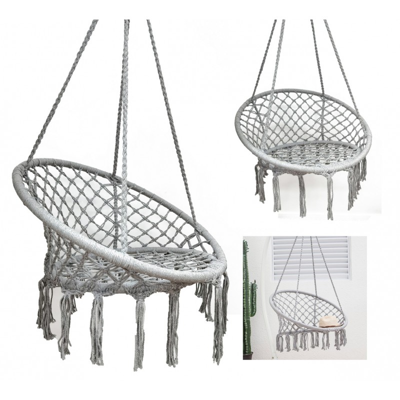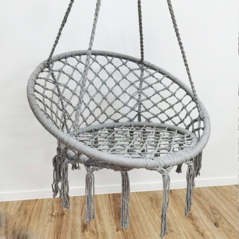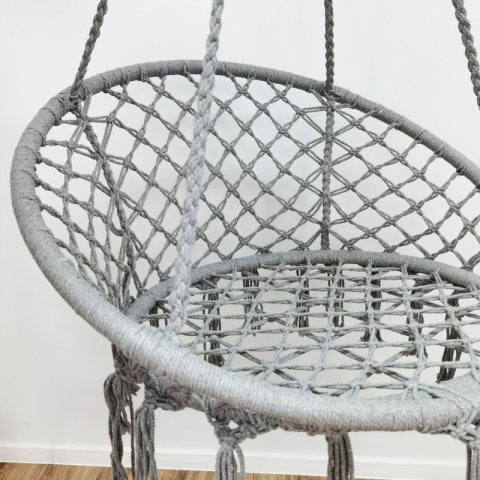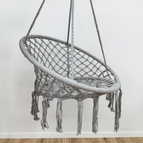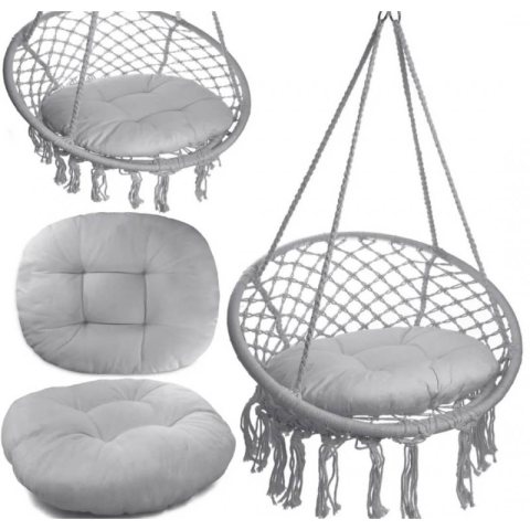 FOTEL WISZĄCY BOCIANIE GNIAZDO, HAMAK BOHO, HUŚTAWKA Z PODUSZKĄ Cudowny dodatek do twojego ogrodu jak i domu, który umili chwile Twojego wypoczynku. Specyfikacja: – Kolor: szary. – Produkt wykonany z wysokiej jakości metalowej konstrukcji oraz wytrzymałego na naprężenia sznurka w postaci splotu. – Huśtawka została zaprojektowana tak, aby siedzenie na niej sprawiało jak najwięcej przyjemności. Wysokie oparcie sprawia, że można się na niej położyć i odpoczywać. – Oparcie, zostało wyposażone w 4 osobne liny, zakończone metalowymi obręczami. Umożliwia to jej zawieszenie. – W zestawie z wygodną poduszką. Możliwe dwa sposoby montażu: – zawieszenie lin na jednym haku, – zawieszenie po dwie liny na dwóch hakach. DANE TECHNICZNE: • maksymalne obciążenie: do 120 kg • 4 mocne, plecione liny. • produkt nadaje się do prania ręcznego. • powierzchnia siedzenia (średnica): 60 cm. • wysokość oparcia: 44 cm • szerokość całkowita huśtawki: 80 cm • długość sznurów: 80cm oraz 90 cm • długość frędzli: 20 cm Dodatkowe informacje: – Elementy potrzebne do montażu huśtawki nie stanowią kompletu z huśtawką wiszącą. Produkt spakowany w opakowanie jednostkowe o wymiarach: 82 x 82 x 5 cm Waga: 3 kg netto / 3,5 kg brutto