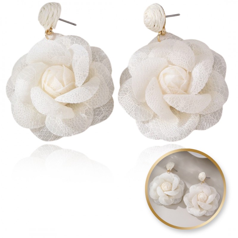 Kolczyki wiszące, efektowne koronkowe kwiat, kremowa RÓŻA sztyft K1708