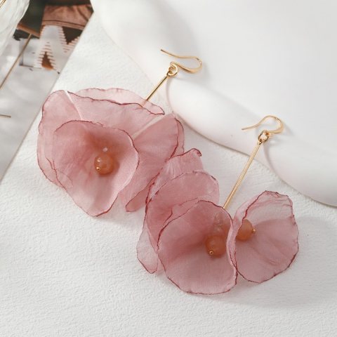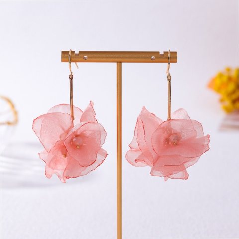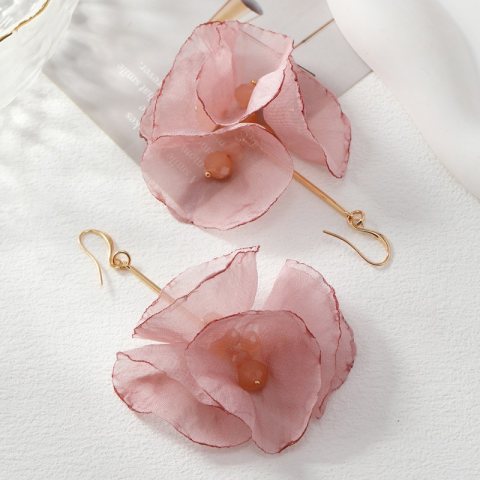 Kolczyki wiszące, efektowne tiulowe z koralikami pudrowy róż K1702