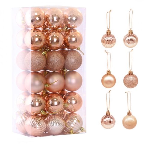 Komplet 36 sztuk bombek na choinkę Poczuj świąteczny klimat! Dodaj swojemu wnętrzu odrobinę zimowej magii. Bombki nadają się jako ozdoba świąteczna do powieszenia na oknie, choince lub jako prezent, a nawet do dekoracji stroików! Specyfikacja: Średnica bombki: 5,5 cm W pudełku zapakowane 36 sztuk Materiał: Tworzywo sztuczne Kolor: Różowe złoto Spakowane w pudełeczko Wymiary opakowania: 35cm x 18cm x 12cm Waga: 330g Dzięki nim magia Świąt Bożego Narodzenia jest jeszcze większa!
