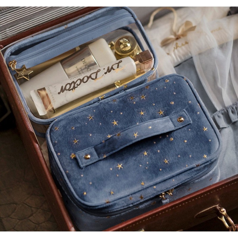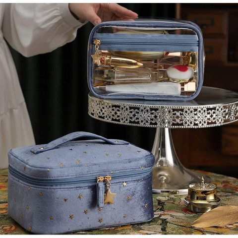 Organizer na kosmetyki / kosmetyczka podróżna 2 w 1 Modny dodatek na podróż – 2 rozkładane kosmetyczki z gwiezdnymi motywami 2 Piękne, damskie rozkładane kosmetyczki, dostępne w kolorze niebieskim Kosmetyczka kuferek wykonana jest z miękkiego, welurowego materiału. Bardzo praktyczna i uniwersalna. Kosmetyczka w sam raz na dłuższe podróże czy wyjazdy – jest bardzo poręczna i pojemna, pomieści wszystkie niezbędne rzeczy. Posiada jedną komorę zasuwaną na zamek, oraz przegródki na pędzle do makijażu. Kosmetyczka jest bardzo pojemna. Wewnątrz znajduje się druga, mniejsza przezroczysta kosmetyczka na bardziej niezbędne kosmetyki. Wymiary: kosmetyczka większa – kuferek : 24,5 x 16,5 x 10 cm kosmetyczka mniejsza: 22,5 x 15 x 15,5 cm