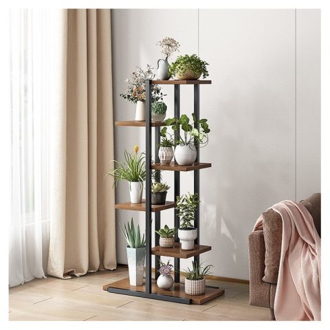 Stojak, kwietnik na rośliny Jeśli uwielbiasz rośliny ten regał jest dla Ciebie! Twoje rośliny w końcu będą pięknie wyeksponowane. Dzięki 6 półkom pomieści sporę ilość doniczek. Stwórz swoją własną kwietną kompozycję! Perfekcyjnie sprawdzi się na balkonie, tarasie, ogródku jak i wewnątrz domu. Specyfikacja: – 6 półek. – Rama z metalu. – Blaty z płyt laminowanych. – Maksymalne obciążenie jednej półki: 2 kg. – Produkt do samodzielnego montażu. Wymiary po złożeniu: 113 x 60 x 20cm Wymiary pudełka: 119 x 25 x 7 cm Waga: 6kg