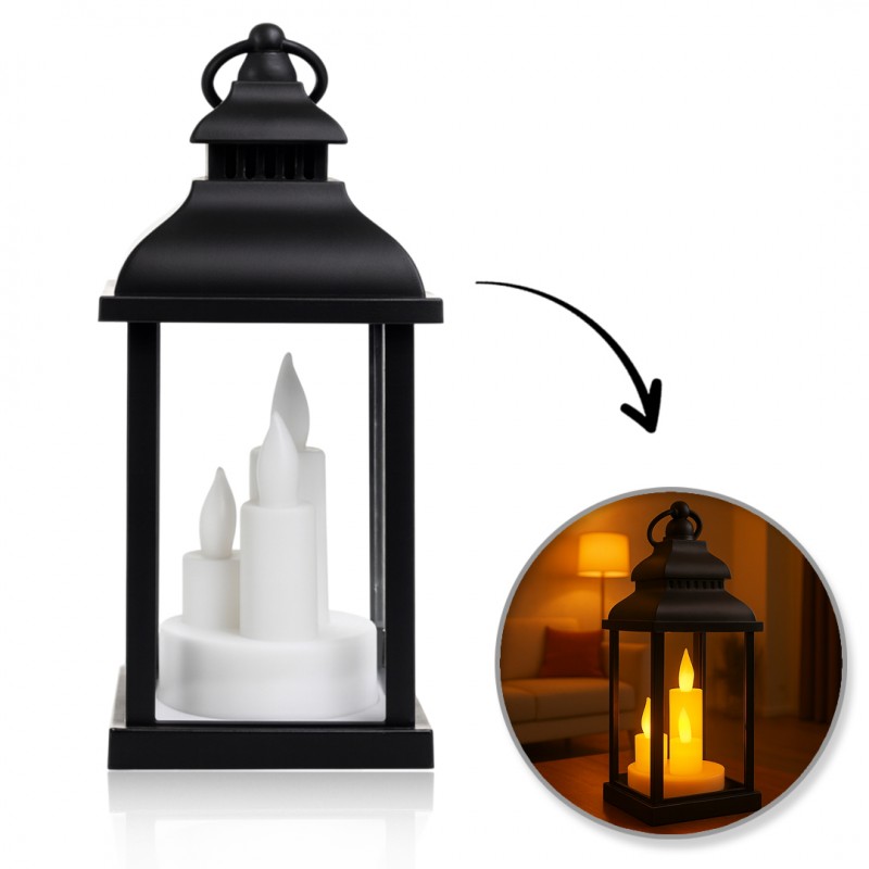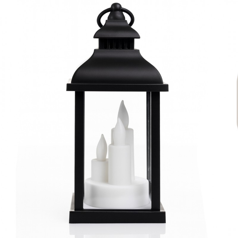 Lampion dekoracyjny LED z imitacją świec Stylowy czarny lampion z tworzywa sztucznego z realistyczną imitacją świec LED. Idealny do wnętrz i na zewnątrz– tworzy nastrojowe, ciepłe światło bez otwartego ognia. Lekki, trwały i bezpieczny w użytkowaniu. Specyfikacja: Materiał: tworzywo sztuczne, szkło Kolor: kremowy, czarny Kolor światła: ciepły biały, mrugające światło Zasilanie: 2 x AA Wymiary lampionu: 10 x 10 x 22 cm Wymiary opakowania: 10,5 x 10,5 x 22,5 cm Waga: 298 g Waga z opakowaniem: 361 g Lampion zapakowany jest w ozdobne kartonowe pudełko idealne na prezent. Zestaw nie zawiera baterii.
