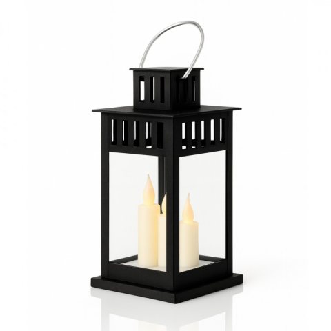 Lampion dekoracyjny LED z imitacją świec Stylowy czarny lampion z tworzywa sztucznego z realistyczną imitacją świec LED. Idealny do wnętrz i na zewnątrz– tworzy nastrojowe, ciepłe światło bez otwartego ognia. Lekki, trwały i bezpieczny w użytkowaniu. Specyfikacja: Materiał: tworzywo sztuczne, szkło Kolor: kremowy, czarny Kolor światła: ciepły biały, mrugające światło Zasilanie: 3 x AAA Wymiary lampionu: 8 x 8 x 15 cm Waga: 131 g Zestaw nie zawiera baterii.