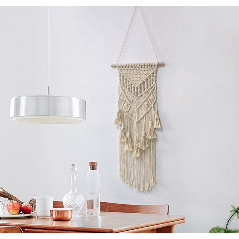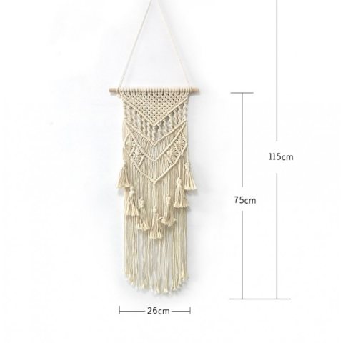 Piękna makrama w klimacie boho pasująca do wielu wnętrzOzdoba możliwa również do zastosowania do sesji fotograficznych czy jako dekoracja przy wielu tematycznych uroczystościachMakrama wyplatana z bawełnianego sznurka plecionego o grubości 5 mm.Wymiary:26 x 78 cm (ze sznurkiem 110 cm)