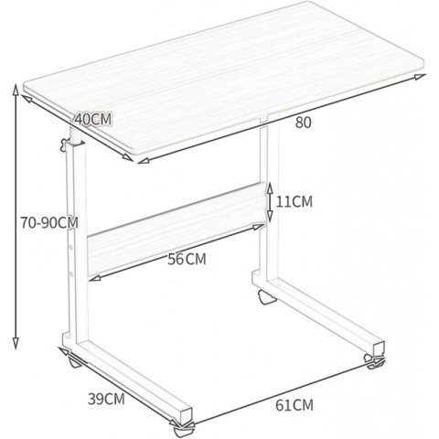 Mobilny stolik pod laptop, tablet lub książkę Cechy produktu: – Gładki blat bez dodatkowych wgłębień pozwala zastosować go w wielu sytuacjach – Posiada kółka, dzięki czemu szybko i sprawnie można przesunąć stolik w dowolne miejsce – Produkt do samodzielnego montażu – Blat z okleiny, rama z metalu Wymiary: – Wymiary blatu: 80 x 40 cm – Regulowana wysokość blatu: 70-90 cm Uwaga: kolor blatów na zdjęciach dotyczy tylko frontów, tył może być inny! Produkt zapakowany w pudełko o wymiarach: 46 x 85 x 6 cm