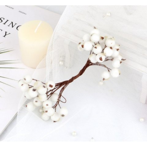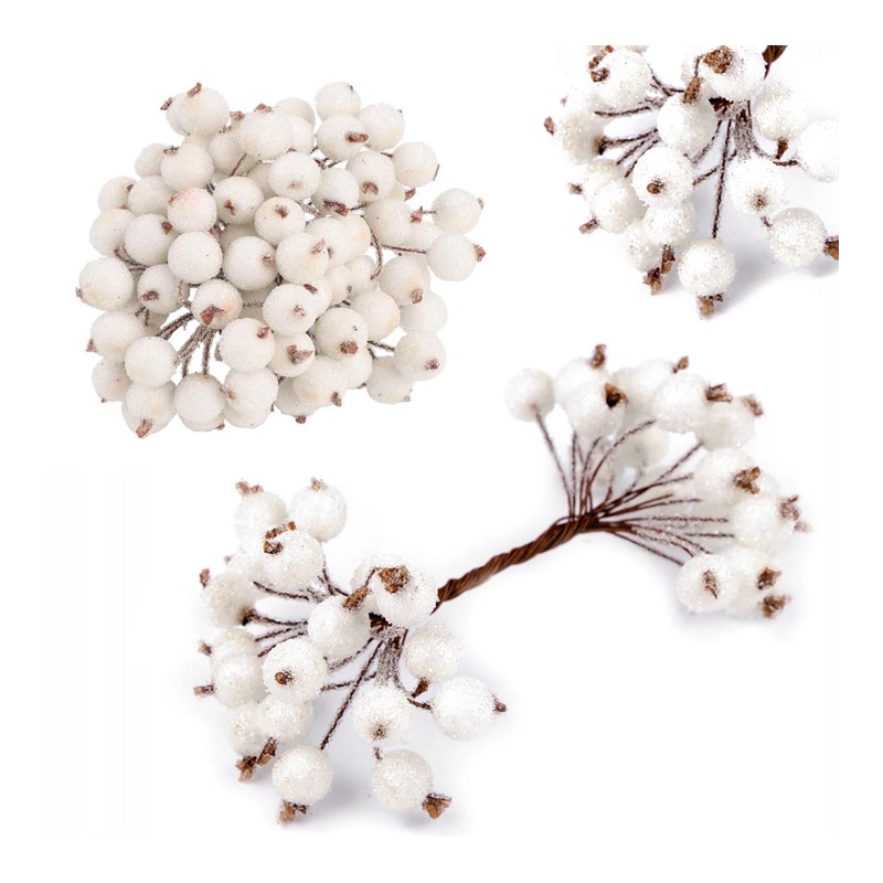Ozdoba Świąteczna Mroźna jarzębina biała sztuczna 20szt wiązka GLZ01 Materiał: Produkt wykonany z tworzywa sztucznego. Wymiary: Wysokość gałązki: 15cm Średnica owoców: 1,2cm Waga: 20g netto / 21g brutto