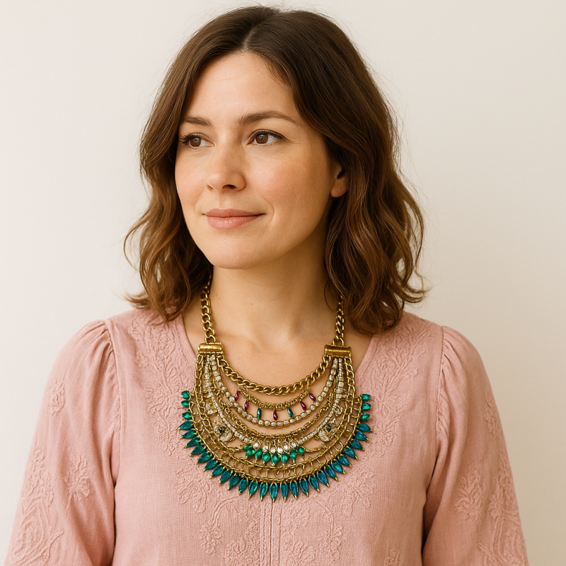 Efektowny naszyjnik Świetnie pasuje do eleganckich, jak również do codziennych stylizacji. Wykonane ze stopów metali nieszlachetnych. Biżuteria antyalergiczna, nie zawiera niklu ani chromu. Unikać kontaktu z wodą, perfumami.