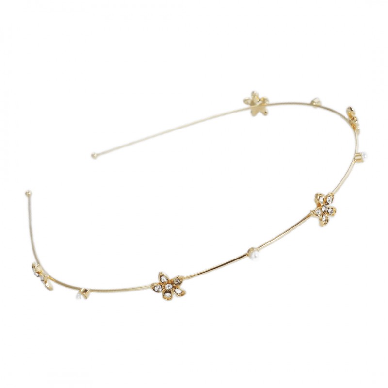 Opaska w kolorze złotym z kwiatuszkamiOpaska do włosówIdealny dodatek na wyjątkową okazje Wykonana z wysokiej jakości stopu metali nieszlachetnych Wymiary: Długość pałąka: 40cm Szerokość: 13 cm x 1,1 cm Waga: 12g