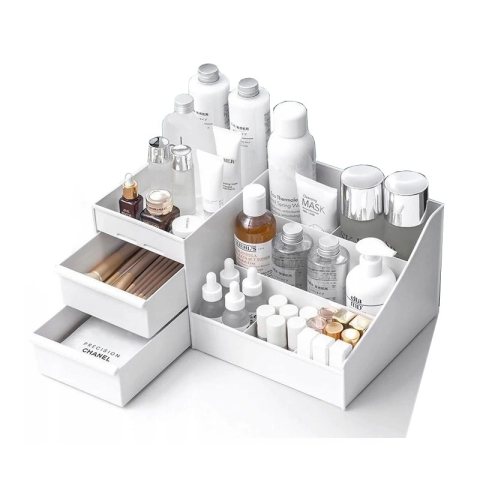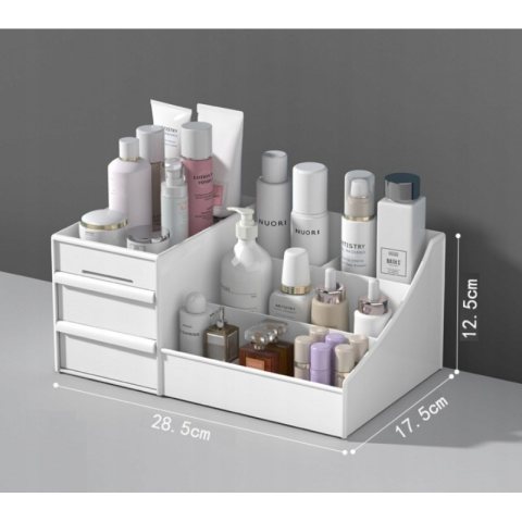 ORGANIZER KOSMETYCZKA DO ŁAZIENKI LUB POKOJU Wykonany z plastiku, w uniwersalnych kolorach! Pozwoli Ci zachować porządek, a także przyczyni się do wystroju wnętrza. Idealny na prezent! Najważniejsze informacje: – uporządkuje Twoje kosmetyki; – praktyczny, z 2 szufladami i 5 różnymi przegródkami – górna część podzielona na segmenty, w których pomieścisz najczęściej używane kosmetyki Wymiary: – długość 25,5 cm – szerokość 15,5 cm – wysokość całkowita: 11,5 cm