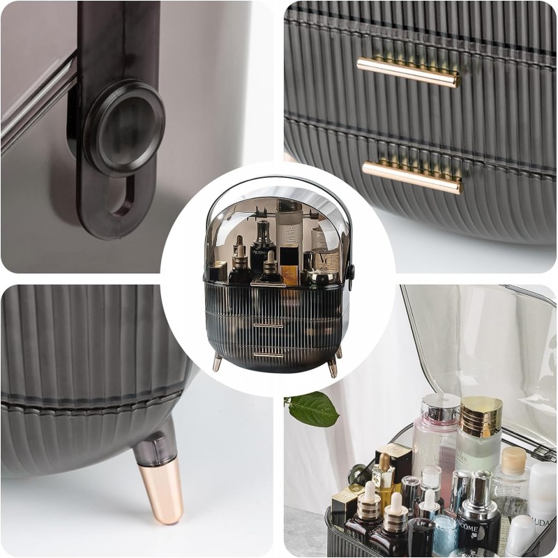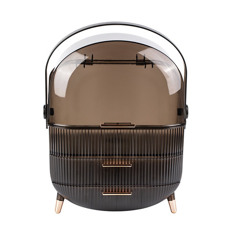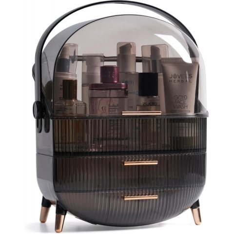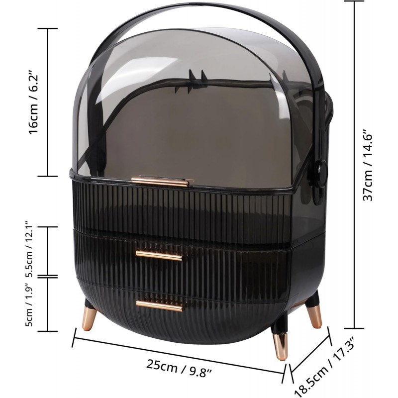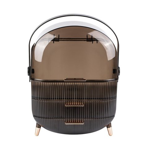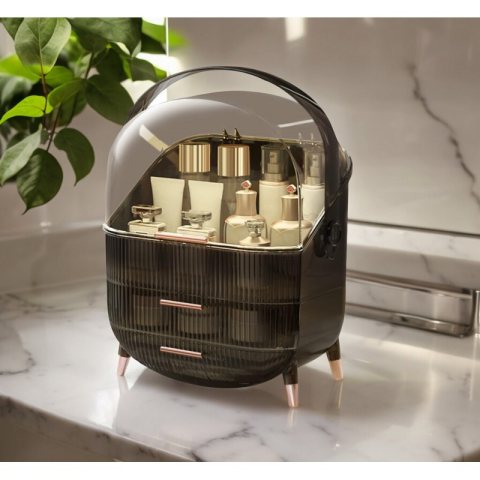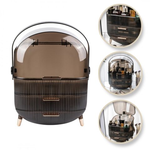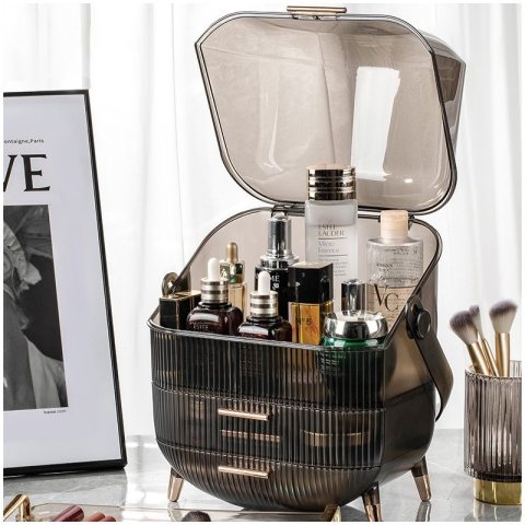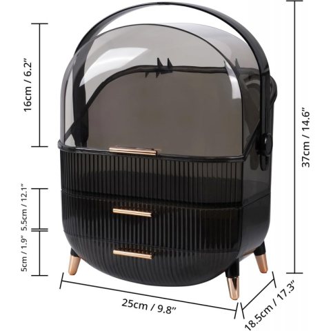 Praktyczny organizer na kosmetyki, biżuterię lub inne akcesoria dla każdej kobiety Jest piękny, elegancki i bardzo pojemny. Oprócz tego jest wyjątkowo piękny i będzie służył jako dekoracja pomieszczenia. Charakteryzuje się pojemnymi szufladkami oraz dużą gablotką na perfumy, balsamy lub kremy. Pozwoli zachować ład i porządek w podręcznych drobiazgach. Organizer wykonany został z akrylu w modnym kolorze, dodatkowo elementy w kolorze złotym sprawiają, że produkt prezentuje się ekskluzywnie. Przeźroczyste wieko pozwala z łatwością odnaleźć potrzebny kosmetyk. Cechy produktu: – Wykonana z wysokiej jakości plastiku – Uporządkuje Twoje kosmetyki – Ekskluzywny wygląd – Solidne wykonanie – Dwie szufladki – Zajmuje mało miejsca – Pomieści wiele najpotrzebniejszych drobiazgów Wymiary: 37 x 28,6 x 18,5 cm Wymiary kartonu: 40cm x 30cm x 23cm Materiał: Akryl Waga: 1393g netto / 1840 g brutto Świetnie sprawdzi się w formie prezentu.