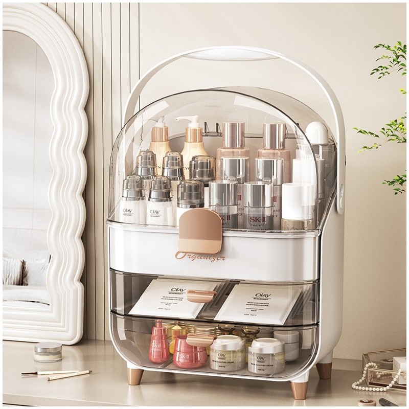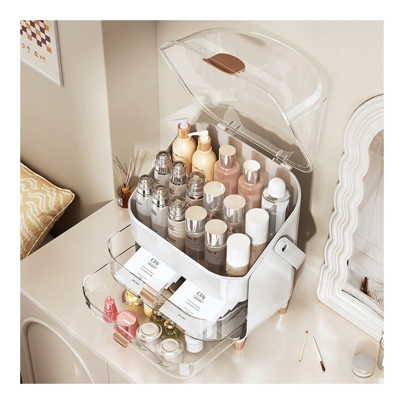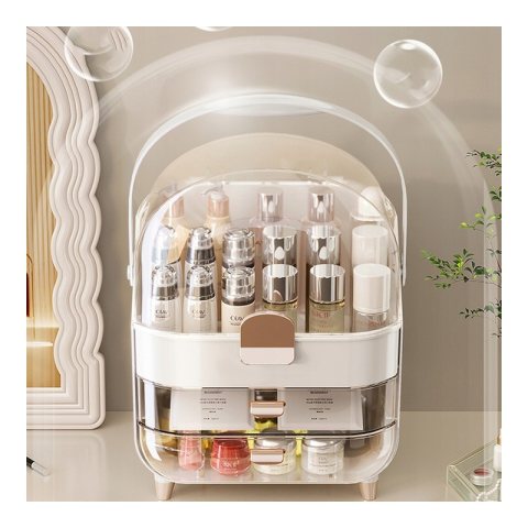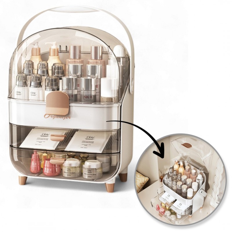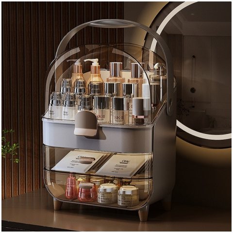 Praktyczny organizer na kosmetyki, biżuterię lub inne akcesoria dla każdej kobiety Organizer jest bardzo elegancki. Oprócz tego jest wyjątkowo piękny i będzie służył jako dekoracja pomieszczenia. Charakteryzuje się pojemnymi szufladkami oraz dużą gablotką na perfumy, balsamy lub kremy. Pozwoli zachować ład i porządek w podręcznych drobiazgach. Organizer wykonany został z akrylu w modnym kolorze, dodatkowo elementy w kolorze złotym sprawiają, że produkt prezentuje się ekskluzywnie. Przeźroczyste wieko pozwala z łatwością odnaleźć potrzebny kosmetyk. Cechy produktu: – Wykonana z wysokiej jakości plastiku – Uporządkuje Twoje kosmetyki – Ekskluzywny wygląd – Solidne wykonanie – Dwie szufladki – Zajmuje mało miejsca – Pomieści wiele najpotrzebniejszych drobiazgów Wymiary: Wysokość całkowita: 38cm szerokość: 27cm głębokość: 18cm Wymiary kartonu: 40cm x 31cm x 22cm Materiał: Akryl Waga: 1410g netto / 1865g brutto Świetnie sprawdzi się w formie prezentu.