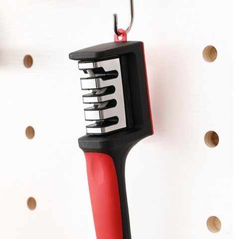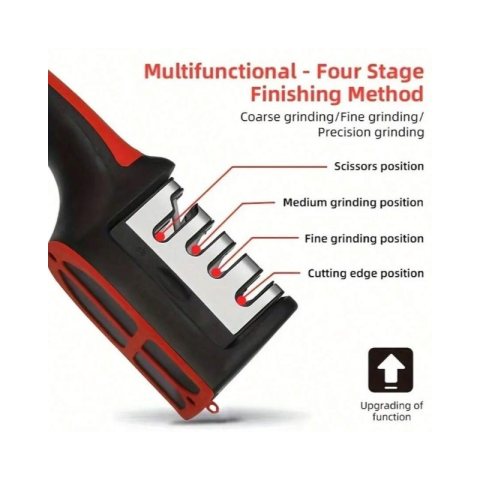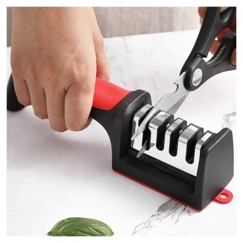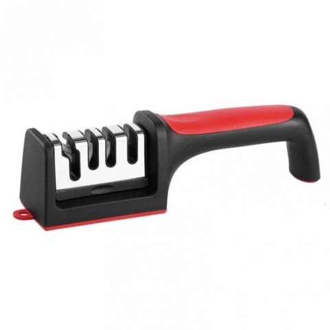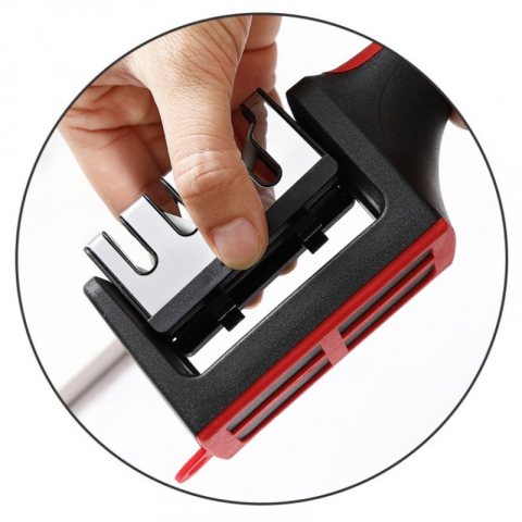 Ostrzałka do noży kuchennych i nożyczek Profesjonalna trójfazowa ostrzałka, osełka do noży kuchennych. Ręczna ostrzałka do noży to 3 gniazda, które posiadają różne funkcje ostrzące. Każdy z etapów ostrzenia jest tak samo ważny, dlatego nie należy ich pomijać. Specyfikacja: -3 gniazdka ostrzące do noży -1 ostrzałka do nożyczek -Wygodny antypoślizgowy uchwyt -Haczyk do powieszenia -Kolor: czarno- czerwony – Materiał: tworzywo sztuczne. – Zapakowany w kartonowe pudełko Wymiary: 21,5 x 5 x 5,6 cm Wymiary opakowania: 22 x 5,5 x 6,8 cm Waga: 153g netto / 183g brutto