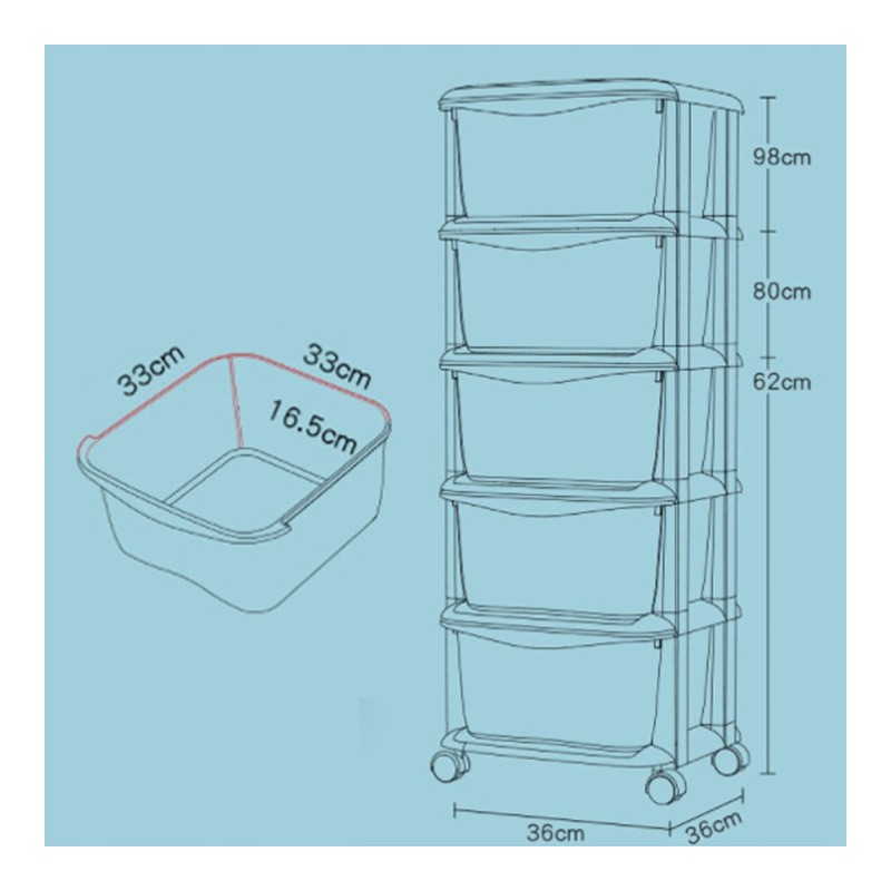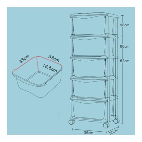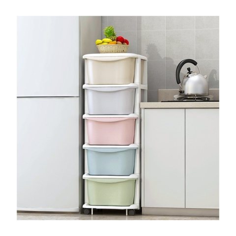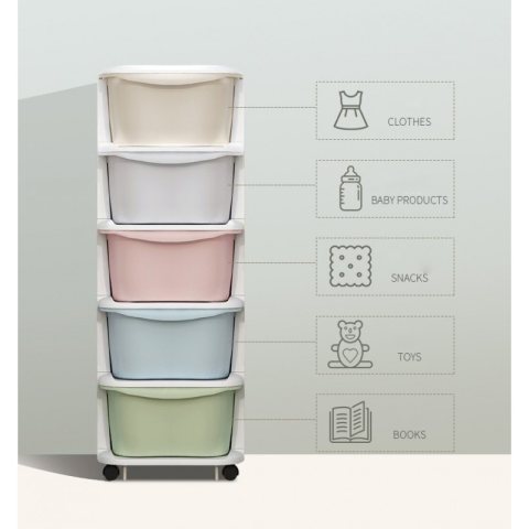 PLASTIKOWY POJEMNIK REGAŁ DO PRZECHOWYWANIAUtrzymanie porządku to często wielkie wyzwanie. Na szczęście mamy na to rozwiązaniePlastikowy regał na kółkach z kolorowymi szufladami dzięki, któremu uporządkujesz swoje rzeczy.Dzięki wykorzystaniu tworzywa o gładkich powierzchniach bardzo łatwo utrzymasz go w czystości.Pojemne szuflady pomieszczą drobne i średnie akcesoria, przedmioty oraz ubrania.Stonowane kolory sprawiają, że z łatwością dopasujesz go do wielu pomieszczeń. Specyfikacja:- Solidny biały stelaż- Pięć kolorowych pastelowych szuflad z wygodnymi uchwytami- Szuflady posiadają blokady zapobiegające przed wypadnięciem- Wykonane z trwałego i elastycznego tworzywa sztucznego- Posiada kółka- Łatwy w utrzymaniu czystości- Trwały produkt- Produkt do samodzielnego montażu- Produkt sprzedawany w pudełkuWymiary:- wysokość: 98 cm- szerokość: 36 cm- głębokość: 36 cm- wymiary pojemnika: 33 x 33 x 16,5 cmWymiary zewnętrzne kartonu z produktem: 37 x 37,5 x 40,5 cm, waga, 3,75 kg