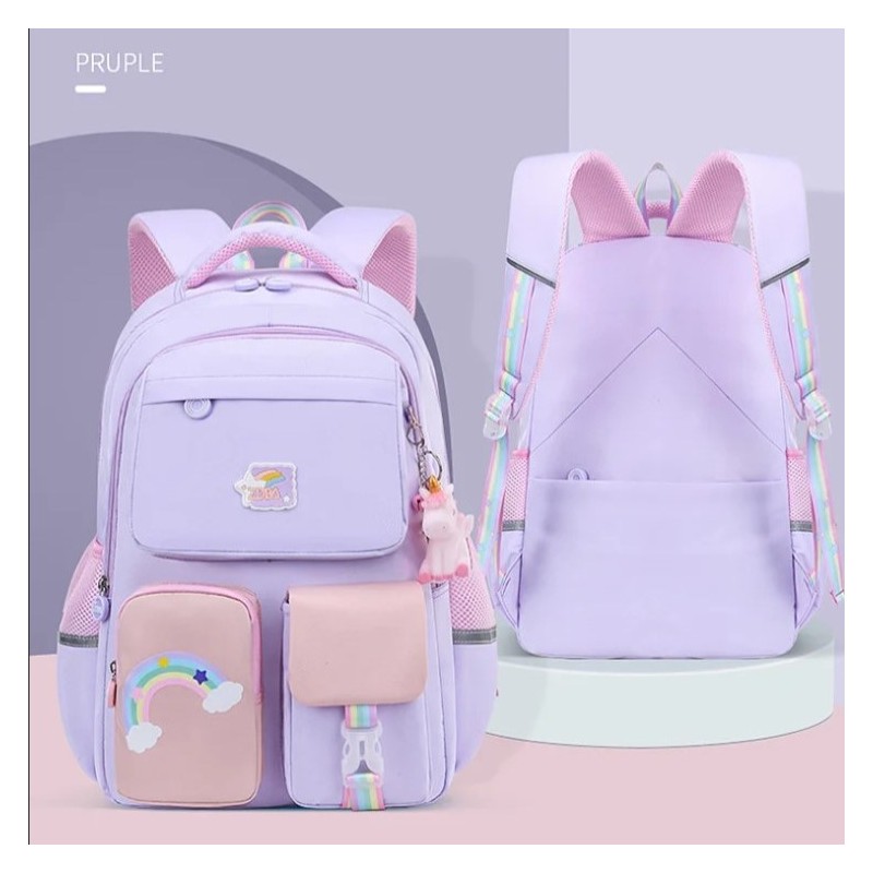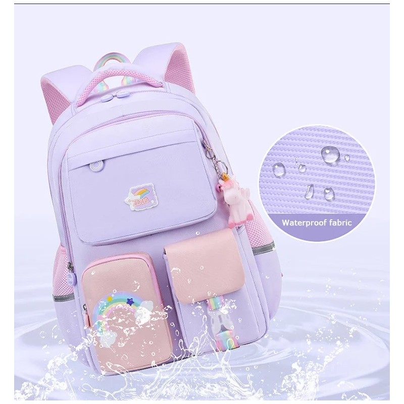 Wodoodporny dziecięcy plecak, szkolny z brelokiemJest bardzo pojemny i praktyczny. Pomieści wszystkie potrzebne rzeczy jak i sprzęt elektroniczny: komputer, tablet, telefon etc.Duża pojemność i przestrzeń do przechowywania, plecak dla dziewcząt, może sprostać różnym potrzebom do szkoły, biura, w podróży.Specyfikacja:- Dwie główne komory pomieszczą książki o standardowych rozmiarach;- Trzy przednie kieszenie są idealne na przybory szkolne, przekąski lub inne małe przedmioty;- Dwie boczne kieszenie mogą dobrze sprawdzić się w trzymaniu butelek z wodą i składanych parasoli;- Tkanina nylonowa, trwała, wodoodporna, odporna na zużycie i rozdarcie, lekka, łatwa do czyszczenia;- Oddychający tylny panel, poszerzone i pogrubione regulowane paski zapewniają wygodę i suchość pleców;- Odblaskowe elementy plecaka zapewniają bezpieczeństwo;- Duża pojemność: 35 litrów Wymiary:45 cm x 30 x 20 cmWaga:770gMateriał:100 % oxfordPodszewka – 100% poliester