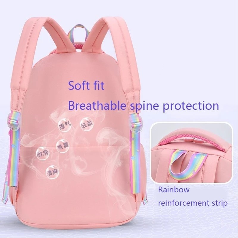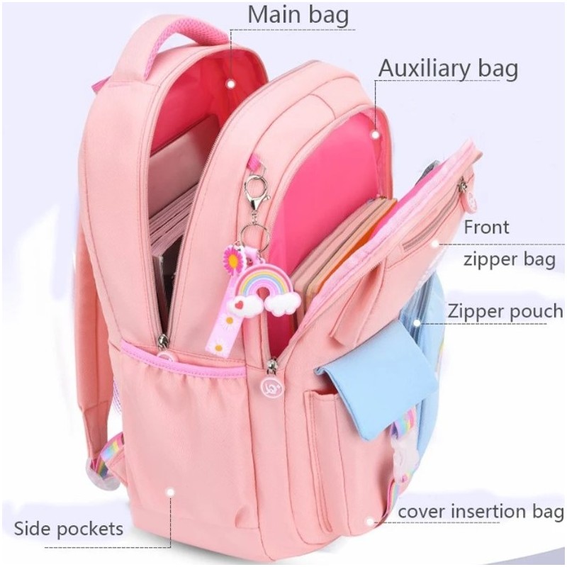 Wodoodporny dziecięcy plecak, szkolny z brelokiemJest bardzo pojemny i praktyczny. Pomieści wszystkie potrzebne rzeczy jak i sprzęt elektroniczny: komputer, tablet, telefon etc.Duża pojemność i przestrzeń do przechowywania, plecak dla dziewcząt, może sprostać różnym potrzebom do szkoły, biura, w podróży.Specyfikacja:- Dwie główne komory pomieszczą książki o standardowych rozmiarach;- Trzy przednie kieszenie są idealne na przybory szkolne, przekąski lub inne małe przedmioty;- Dwie boczne kieszenie mogą dobrze sprawdzić się w trzymaniu butelek z wodą i składanych parasoli;- Tkanina nylonowa, trwała, wodoodporna, odporna na zużycie i rozdarcie, lekka, łatwa do czyszczenia;- Oddychający tylny panel, poszerzone i pogrubione regulowane paski zapewniają wygodę i suchość pleców;- Odblaskowe elementy plecaka zapewniają bezpieczeństwo;- Duża pojemność: 35 litrów Wymiary: 45 cm x 30 x 20 cmWaga:770gMateriał:100 % oxfordPodszewka – 100% poliester