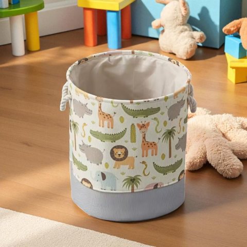 Pojemnik na zabawki, kosz na pranie Praktyczny dodatek do pokoju lub łazienki. Worek, organizer na zabawki, pranie lub inne produkty. Połączenie stylu skandynawskiego z praktycznością. Posiada praktyczne rączki do przenoszenia pojemnika z miejsca na miejsce. Skład: Brezent bawełniany – sztywny materiał Wymiary: 40cm x 35 cm Waga: 345g Sprawdzi się świetnie do przechowywania zabawek, pościeli, ciuchów i innych.