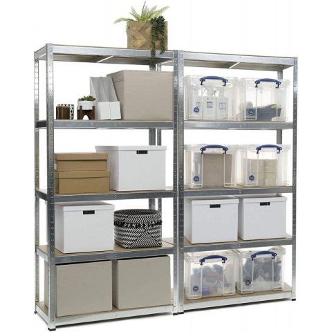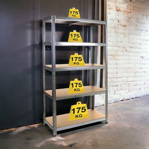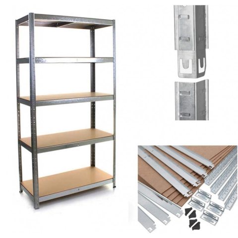 5 – poziomowy, metalowy regał magazynowy Praktyczny i uniwersalny regał na magazyn, do warsztatu, sklepu, piwnicy czy spiżarni. Specyfikacja: – Składa się z pięciu półek, których wysokość można dowolnie konfigurować. – Maksymalne obciążenie każdej półki wynosi 175 kg, a maksymalne obciążenie łączne to 875 kg. – Stelaż wykonany z metalowych, galwanizowanych profili z zaokrąglonymi krawędziami. – Półki z wytrzymałej płyty MDF. – Produkt do samodzielnego montażu metodą ”na wcisk” – bez śrub. Wymiary po złożeniu: 90 x 180 x 40 cm Wymiary jednostkowe pudełka: 95 x 40 x 6 cm Waga produktu z opakowaniem: 20 kg