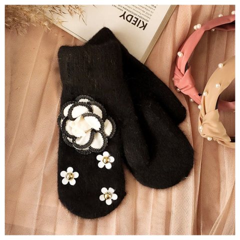 Urocze rękawiczki w odcieniach czerni Rękawiczki posiadają delikatne zdobienia z perełek i kokardek Nadadzą każdej zimowej stylizacji wyjątkowego charakteru. Rękawiczki bardzo ciepłe i cieszące się bardzo dużym zainteresowaniem. Wymiary 22 cm x 9,5 cm Skład: 30% BAWEŁNA 70% AKRYL
