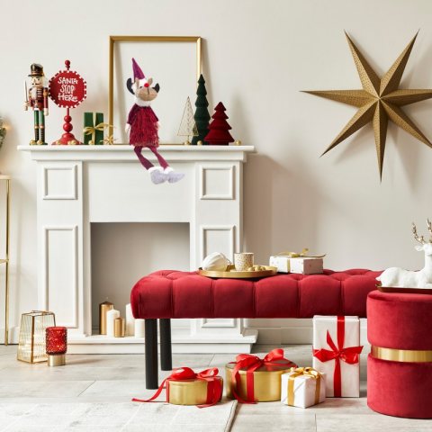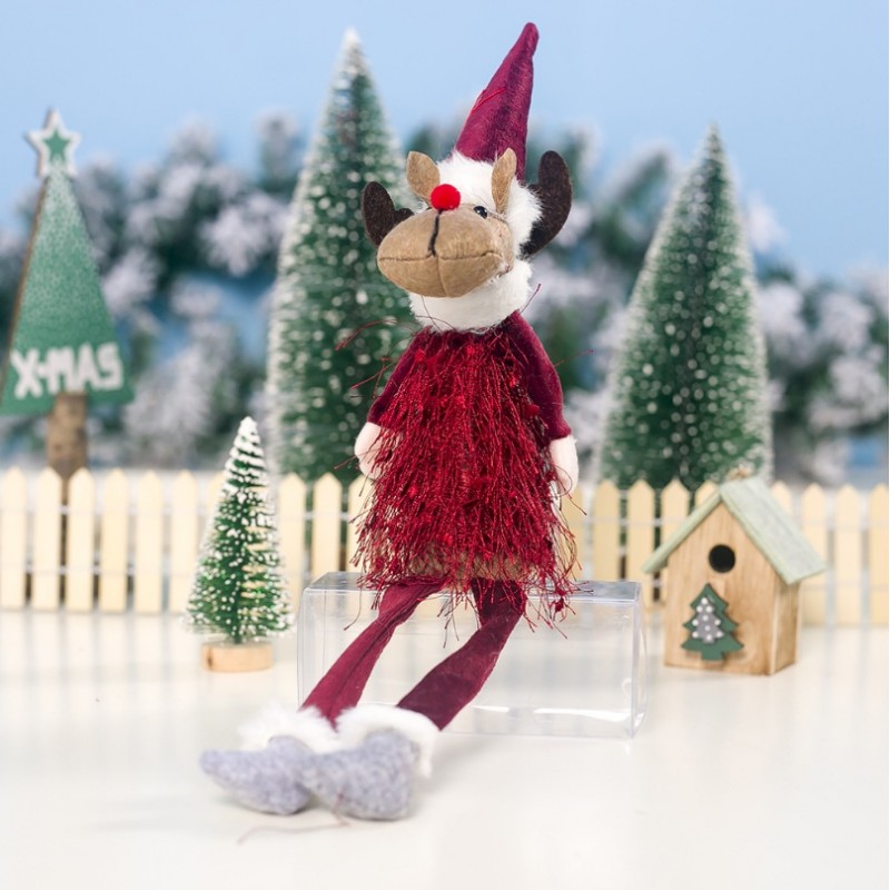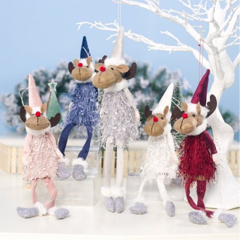 Siedzący renifer z wiszącymi nóżkami Wypełniony pluszem Dla stabilizacji pozycji stojącej w tułowiu posiadają piasek – co dodatkowo je obciąża Figurki ze sznurkiem – można je powiesić Waga: 82 g Wymiary: Wysokość maksymalna : 37 cm Szerokość: 9 cm