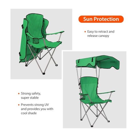 Składane krzesło turystyczne z daszkiem To idealny towarzysz wszystkich zajęć rekreacyjnych na wolnym powietrzu: kemping, wędkarstwo, wakacje na plaży czy w ogrodzie – wystarczy usiąść i cieszyć się spokojem. Krzesło jest łatwe do składania. Wystarczy jeden ruch i możesz cieszyć się wygodnym siedziskiem. Duzy daszek zapewni cień w najgorętsze dni i w razie potrzeby ochroni przed deszczem. Fotel posiada pokrowiec z rączką, dzięki którem zabierzesz go ze sobą w nie jedną wyprawę. Wymiary: – Wysokość całkowita: 124 cm – Wysokość siedziska 45 cm – Szerokość miedzy podłokietnikami- 73 cm – Głębokość siedziska: 43 cm -Wymiar daszku: 75 x 50cm Maksymalny udźwig krzesła do 120 kg. Wymiary krzesła w pokrowcu: 89 x 18 x 16 cm Wymiary kartony: 91 x 20 x 18 cm Waga krzesła z pokrowcem: 4 kg