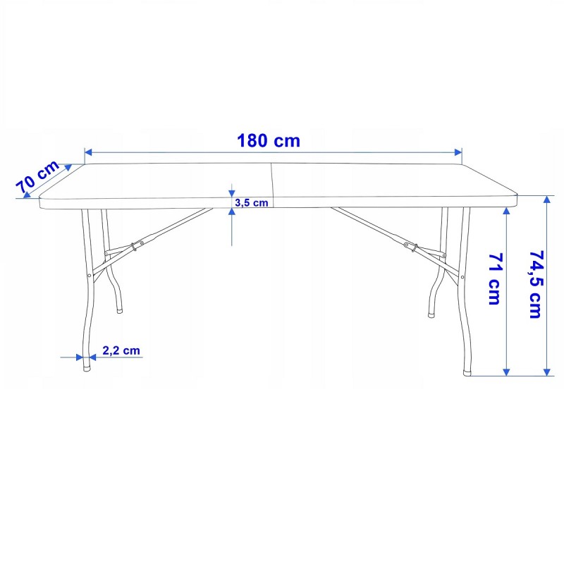 Profesjonalny stół cateringowy 70 x 180 cm składany w walizkę Praktyczny i uniwersalny stół idealny na kemping lub imprezy plenerowe. Bardzo praktyczny i lekki. Stolik po złożeniu tworzy praktyczną walizkę, dzięki czemu zajmuje małą przestrzeń i jest łatwy do przeniesienia. Specyfikacja: – Wymiary blatu: 70 x 180 cm, wysokość 74 cm – Stabilna konstrukcja – 100% wodoodporny – Trwały – Konstrukcja wykonana ze stali malowanej proszkowo. – Blat wykonany z mocnego tworzywa sztucznego HDPE 3,5 cm – Składany, wygodne rączki do transportu – Lekki, zajmuje mało miejsca po spakowaniu Maksymalne równomierne obciążenie: około 100 kg Waga: 10 kg netto / 11 kg brutto Wymiary opakowania: 100 x 81 x 9 cm UWAGA: 1 produkt to 1 paczka. Nie ma możliwosci wysyłki 2 szt. jako 1 paczka.