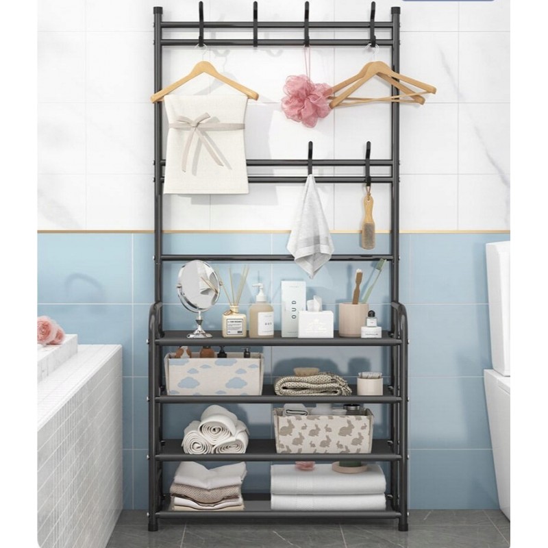 Uniwersalny wieszak na ubrania z półkami Praktyczny wieszak sprawdzi się świetnie do codziennej organizacji domu czy biura. Możesz postawić go w przedpokoju, garderobie czy łazience. Bez problemu pomieści kurtki, płaszcze, bluzy, buty oraz inne akcesoria. Specyfikacja: – Uniwersalny design – Lekka i wytrzymała konstrukcja – Idealny na okrycia wierzchnie, buty czy akcesoria – Zajmuje mało miejsca – Pozwala utrzymać porządek – Produkt do samodzielnego montażu – Materiał: METAL, PLASTIK, MATERIAŁ Wymiary: 152cm x 80cm x 26cm Wymiary kartonu z wieszakiem: 79cm x 27cm x 7cm, waga: 3 kg