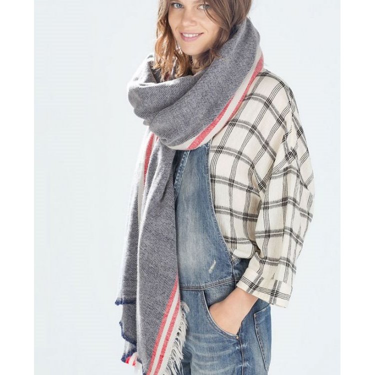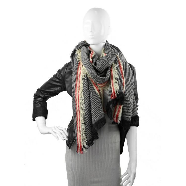 Elegancki szal / chusta w kolorach szarości i moreli Wymiary : 200 cm x 80 cm Materiał : 80 % wiskoza 20 % bawełna Idealny do jesiennych kurtek oraz zimowych płaszczy.