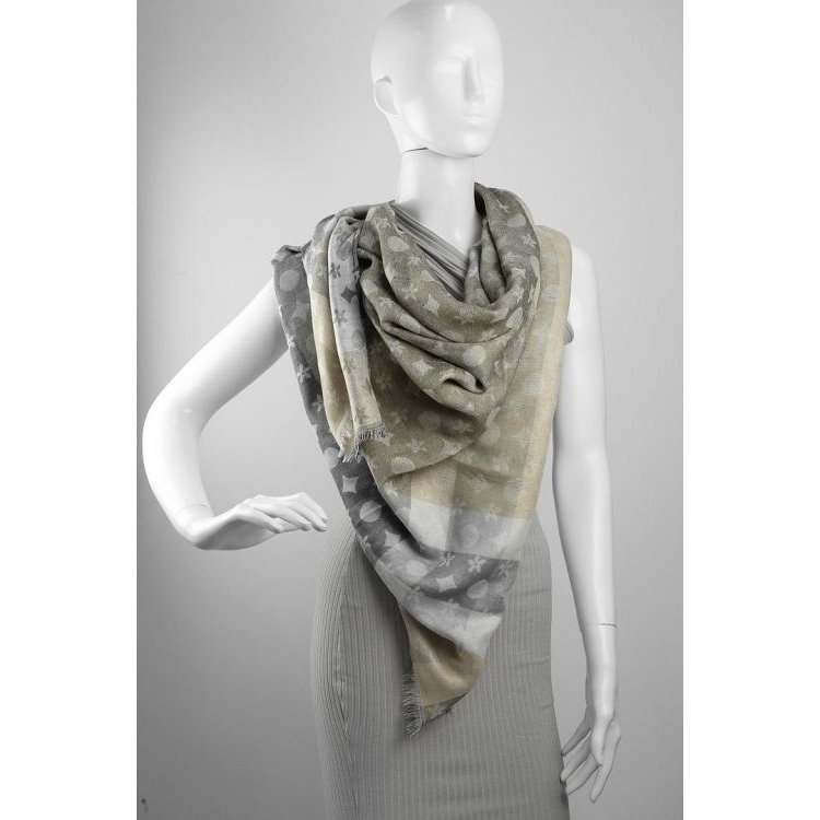 Elegancki szal / chusta w odcieniach koloru szarego i beżowego Wymiary : 140 cm x 140 cm Materiał : 100 % Poliester Idealny do jesiennych kurtek oraz zimowych płaszczy.