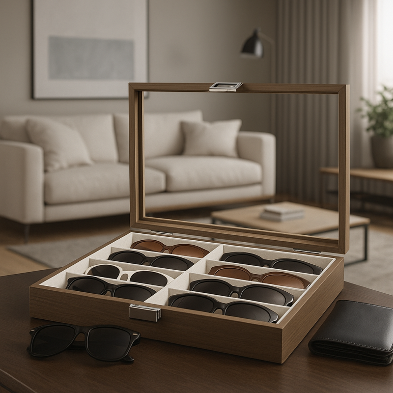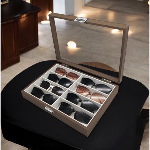 Szkatułka 8 przegródek na okulary lub akcesoria, etui organizer, szkło PDMDF07