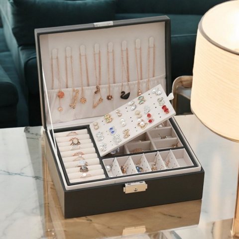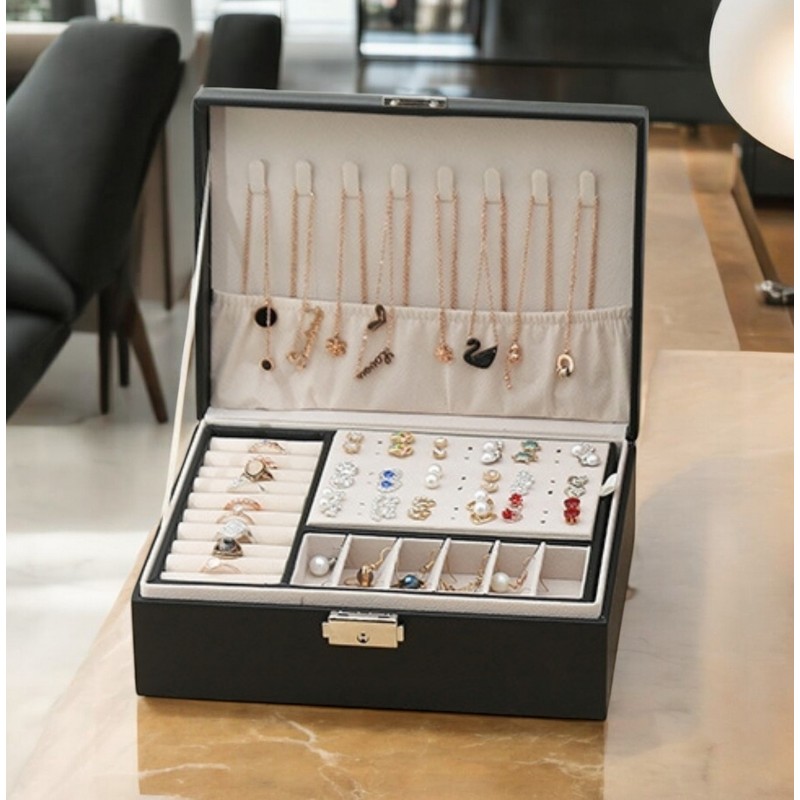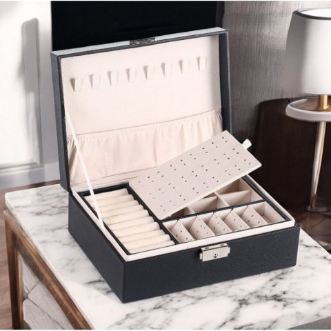 ELEGANCKA SZKATUŁKA NA BIŻUTERIĘ Bardzo elegancka i wspaniale prezentująca się szkatułka na biżuterię Bardzo funkcjonalna z przegródkami oraz miejscami na naszyjniki, kolczyki oraz pierścionki. Dolny poziom idealny do przechowywania zegarków oraz większej biżuterii. Jest niezwykle praktyczna można w niej uporządkować i zabezpieczyć przed zniszczeniem bardzo dużą ilość biżuterii. Cechy produktu: – wysokiej jakości materiały użyte do produkcji to gwarancja jakości – bardzo funkcjonalny – pozwala wygodnie przechować dużą ilość biżuterii w jednym miejscu w sposób uporządkowany – posiada metalowy zamek – pokryta eleganckim materiałem – środek wypełniony miękkim welurowym materiałem Wymiary zewnętrzne: Wysokość – 8,5 Szerokość – 23 Głębokość – 17 Przegródki: 8 haczyków na naszyjniki 37 miejsc na kolczyki 9 miejsc na pierścionki 9 przegródek na drobiazgi 4,2 x 2,7 cm dolny poziom skrywa 6 przegródek Wymiary opakowania: 24cm x 18cm x 9cm Waga: 700g netto / 760g brutto