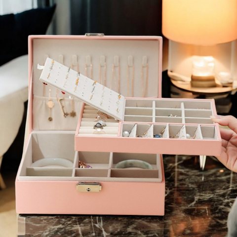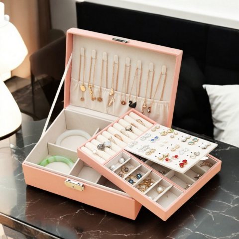 ELEGANCKA SZKATUŁKA NA BIŻUTERIĘ Bardzo elegancka i wspaniale prezentująca się szkatułka na biżuterię Bardzo funkcjonalna z przegródkami oraz miejscami na naszyjniki, kolczyki oraz pierścionki. Dolny poziom idealny do przechowywania zegarków oraz większej biżuterii. Jest niezwykle praktyczna można w niej uporządkować i zabezpieczyć przed zniszczeniem bardzo dużą ilość biżuterii. Cechy produktu: – wysokiej jakości materiały użyte do produkcji to gwarancja jakości – bardzo funkcjonalny – pozwala wygodnie przechować dużą ilość biżuterii w jednym miejscu w sposób uporządkowany – posiada metalowy zamek – pokryta eleganckim materiałem – środek wypełniony miękkim welurowym materiałem Wymiary zewnętrzne: Wysokość – 8,5 Szerokość – 23 Głębokość – 17 Przegródki: 8 haczyków na naszyjniki 37 miejsc na kolczyki 9 miejsc na pierścionki 9 przegródek na drobiazgi 4,2 x 2,7 cm dolny poziom skrywa 6 przegródek Wymiary opakowania: 24cm x 18cm x 9cm Waga: 700g netto / 760g brutto