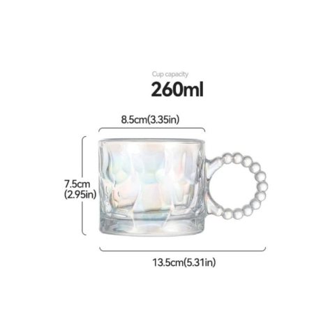 Szklanka opalizująca do kawy, drinków- 1szt. Wykonana z wysokiej jakości odpornego na uszkodzenia szkła. Dzięki odpowiednio dobranym rozmiarom, szklanki idealnie mieszczą się w dłoni i pozwalają cieszyć się ich zawartością. Ładnie się prezentują zarówno w trakcie użytkowania jak i spoczywając w witrynie mebli. Wymiary: Wysokość – 7,5 cm Średnica – 8,5 cm Szerokość ucha- 5 cm Pojemność – 260 ml Szklanka spakowana w pudełko jednostkowe o wymiarach: 13 cm x 9,5 cm x 9,5 cm Waga: 290g netto / 330 g brutto