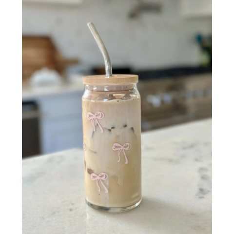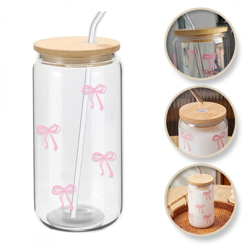 Szklanka, różowe kokardki – z rurką i bambusową pokrywką 500 ml – SZK131