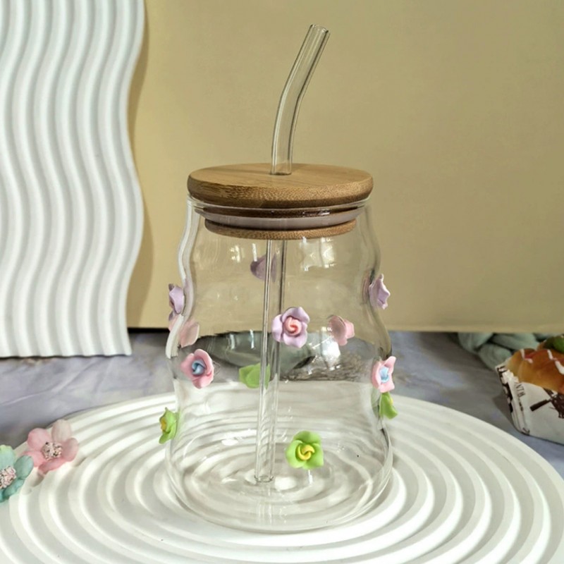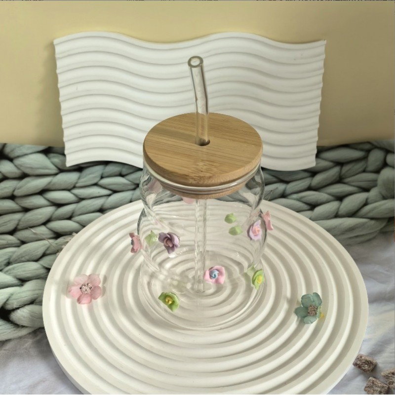 Szklanka z falowanymi ściankami i kwiatkami 450 ml ze słomką i pokrywką SZK164