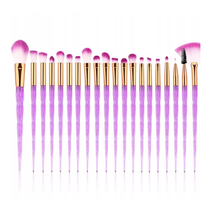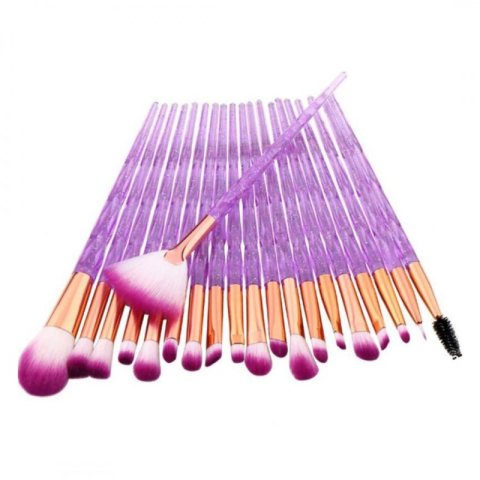 Zestaw pędzli do makijażu Spraw sobie nie tylko użyteczny, ale również piękny zestaw pędzli. Aby uzyskać w łatwy sposób wspaniały i efektowny makijaż proponujemy Ci zestaw 20 pędzli do makeup’u W zestawie 20 precyzyjnych pędzelków do makijażu oczu, szczoteczka do brwi oraz 2 większe pędzle do twarzy. Włosie pędzli osadzone jest przy pomocy skuwki w kolorze miedzianym na transparentnym trzonku z zatopionym wewnątrz kolorowym brokatem. Każdy pędzel pakowany jest osobno w folię. Dzięki użytym syntetycznym materiałom do produkcji włosia nie wchłania ono dużej ilości kosmetyków i jest łatwe w utrzymaniu w czystości wystarczy je przemyć wodą z mydłem.