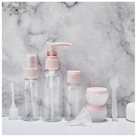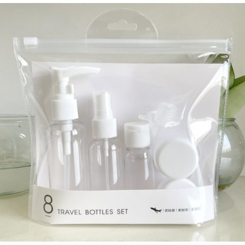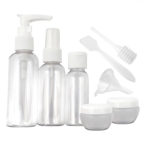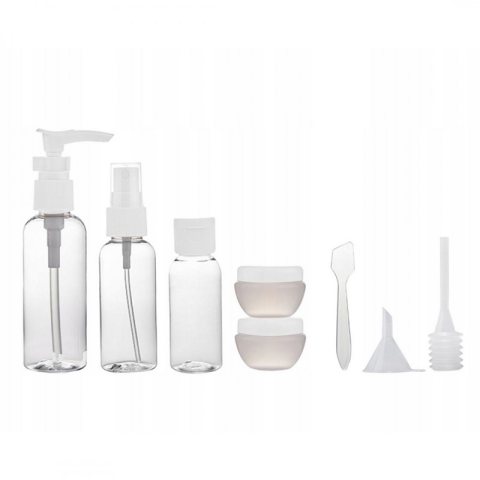 ZESTAW BUTELECZEK PODRÓŻNYCH 8 częściowy zestaw buteleczek i pojemniczków, specjalnie zaprojektowanych do przewożenia kosmetyków w podróży. Szczelnie zamykane, chronią przed przypadkowym wyciekiem w walizce, czy torbie podróżnej Wymiary: Podane na ostatnim zdjęciu
