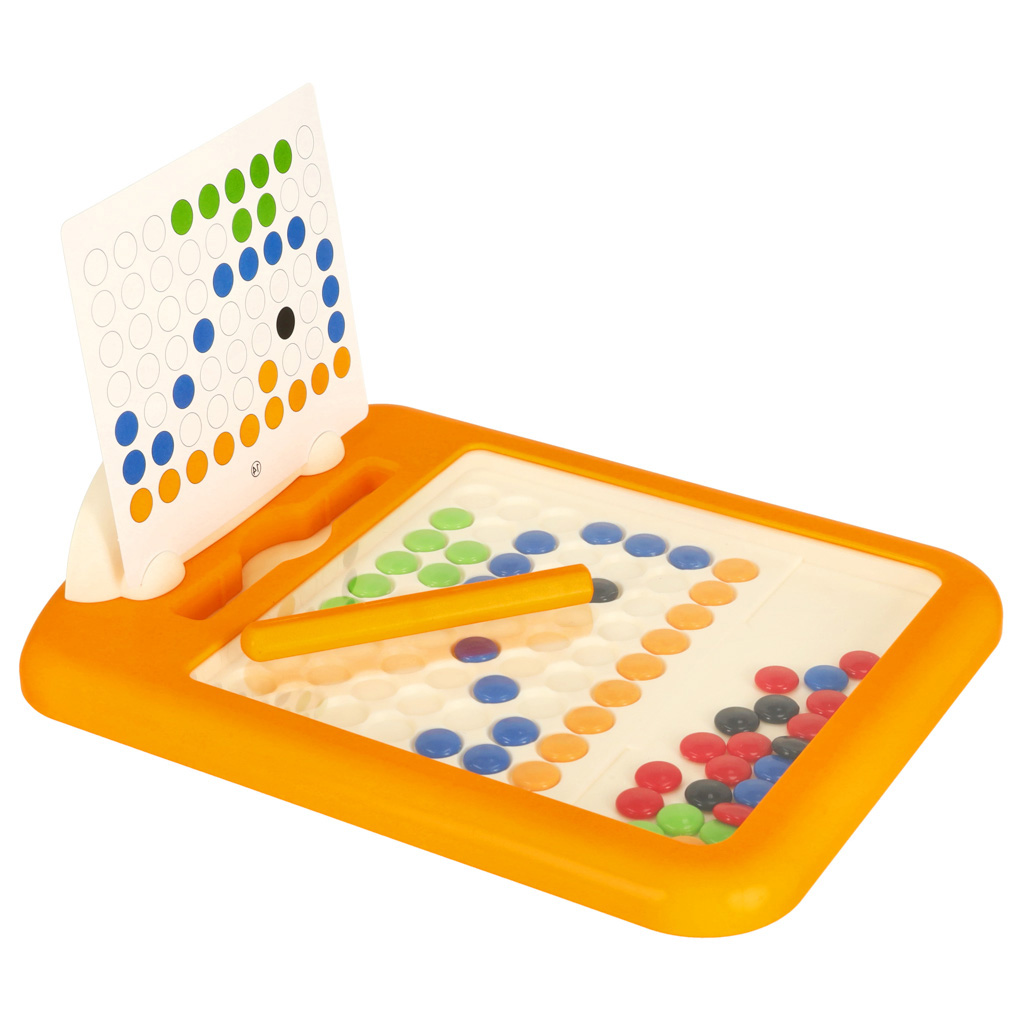 Tablica magnetyczna posiada kolorowe guziki, które można przesuwać przy pomocy magnetycznego długopisu i układać w przeróżne mozaiki, wzory i obrazki. Dziecko może wzorować się na dostępnych przykładach lub samodzielnie wymyślać nowe dzieła. Na tablicy znajduje się króliczek, który będzie towarzyszył maluchowi podczas zabawy.